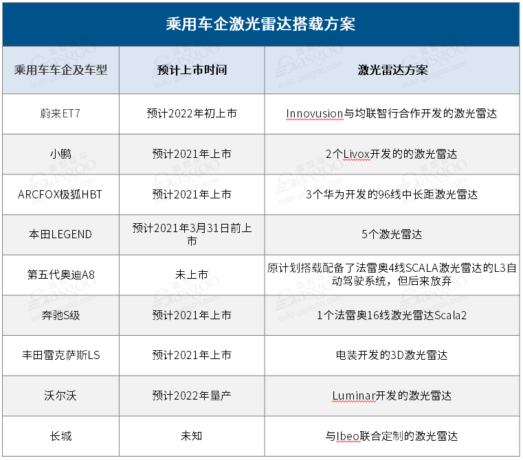 乘用車企激光雷達搭載方案,蓋世汽車整理