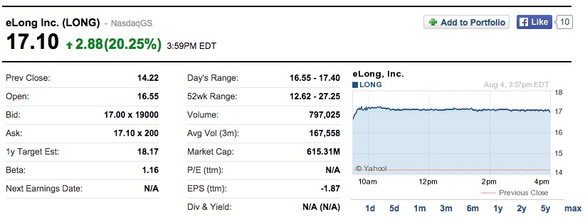 鳳凰科技訊 北京時間8月5日消息,據(jù)投資網(wǎng)站BidnessEtc報道,在接到騰訊的私有化要約后,藝龍股價周二大漲逾20%。