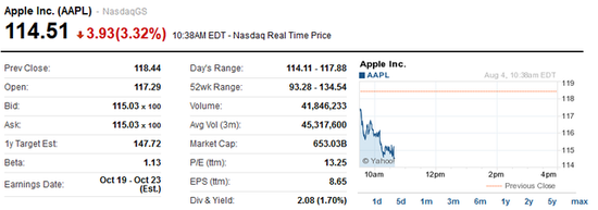 周一,蘋果股價(jià)收?qǐng)?bào)118.19美元,下挫2.5%,跌至今年1月以來(lái)低位。蘋果股價(jià)自2013年9月以來(lái)首次跌破200日移動(dòng)均線,200日均線往往被認(rèn)為是支撐股價(jià)的技術(shù)指標(biāo)。蘋果市值年初超過(guò)7000億美元時(shí),庫(kù)克曾認(rèn)為中國(guó)市場(chǎng)功不可沒(méi)。但二季度在中國(guó)銷量不及預(yù)期,也拖累了蘋果股價(jià)。
