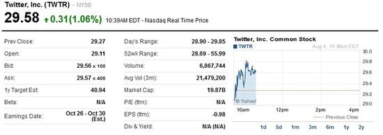 此前Twitter二季度財(cái)報(bào)令市場(chǎng)失望,導(dǎo)致該公司股價(jià)暴跌。周一,Twitter收盤價(jià)跌至歷史最低點(diǎn),市場(chǎng)普遍對(duì)該公司增長(zhǎng)前景感到擔(dān)憂。周一該公司股價(jià)收盤下跌超過(guò)5.5%,至29.27美元,并在盤中一度跌破29美元,跌幅超過(guò)6%,不過(guò)仍高于發(fā)行價(jià)每股26美元。上周,Twitter股價(jià)累計(jì)跌幅已達(dá)到15%。