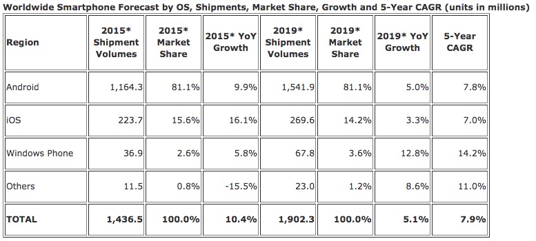 IDC預(yù)計(jì)的2015年和2019年智能手機(jī)市場份額