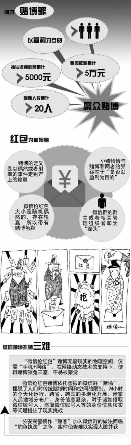正如王先生所說,“微信搶紅包”隱蔽性強(qiáng)、流動(dòng)性大、傳播速度快、迷惑性強(qiáng)、影響面廣。相比傳統(tǒng)線下賭博案件,查處上困難更大。