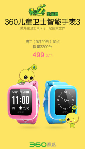 兒童智能手表360兒童衛士進軍娛樂圈,宣布與電影《長江7號超萌特攻隊》達成戰略合作,推出360兒童衛士智能手表3長江7號限量版,全球僅有3200臺,售價499元,將于9月29日上午10點整,在360商城(mall.360.com)限量搶購。