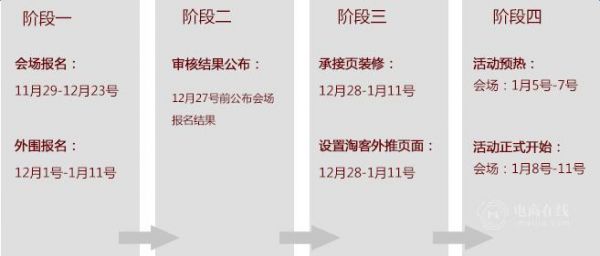 作為2017年的開年首場重要大促,2017年貨節將開啟淘寶新一年的狂歡盛宴。活動正式開始時間為2017年1月8日至11日,會場預熱時間為2017年1月5日至7日。目前,會場和外圍活動報名都已經開始,12月27日將公布會場報名的審核結果。具體的時間節奏如下圖: