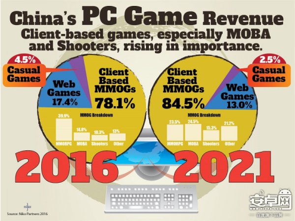 截至2021年的未來5年,PC網游收入的年復合增長率只有1.5%,但是主要游戲構成將發生重大變化。大型多人在線角色扮演游戲(MMORPG)在PC網游中的占比將下滑,而多人在線戰術競技游戲(MOBA)和第一人稱射擊游戲(FPS)的占比將提升。