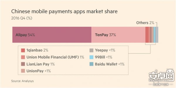 在如此巨大的市場中,又數支付寶和微信占據龍頭地位。截止2016年底,支付寶已經擁有54%的市場份額,以微信為代表的騰訊的市場份額達37%。剩下不到10%的市場份額被其他多家機構分割,而去年初在中國推出的Apple Pay并沒有擠入前十。中國的移動支付市場形成了寡頭格局。