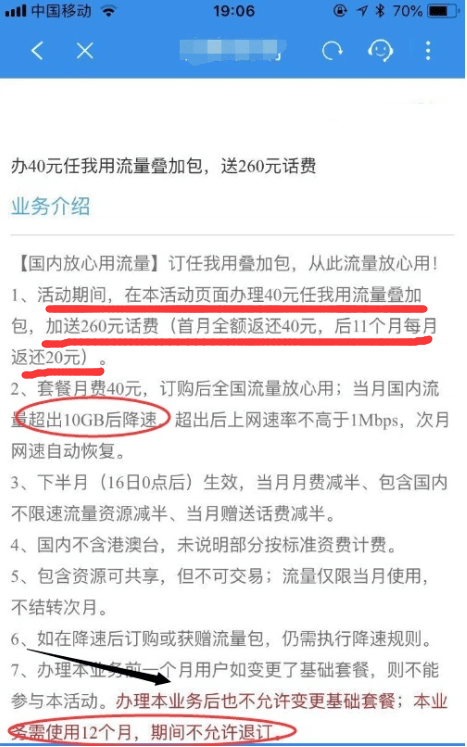 從圖中我們可以看到,這是一款叫做“任我用”的套餐,相信移動的老用戶應該都是清楚的。其實這款套餐并不是真正意義上的20元“不限流量”,而是有12個月的優惠期,期間只需要20元每月,而優惠到期后,就會恢復40元的原月費。但套餐中依舊不變的就是“無限流量”了,不過采用的卻是最低的限速閥,每個月使用超過10G之后就會限速至1Mbps,看到這,不少網友表示:“移動終于良心了嗎?”