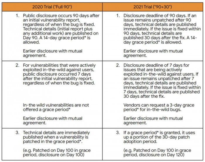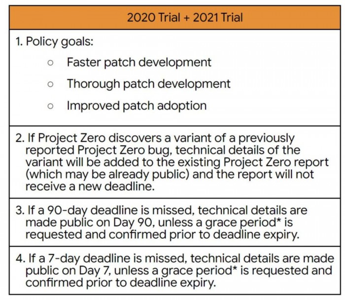 今天的這項調整對于安全領域來說非常重要,因為目前網絡安全社區的很多人都已采用 Project Zero 的規則作為向軟件供應商、向公眾披露安全漏洞的非官方方法。在今天之前,谷歌 Project Zero 的研究人員會給軟件廠商 90 天的時間來修復一個安全漏洞。當 bug 被修復后,或者在 90 天時間窗口結束時,谷歌研究人員會在網上(在他們的 bug 跟蹤器上)公布有關 bug 的細節。