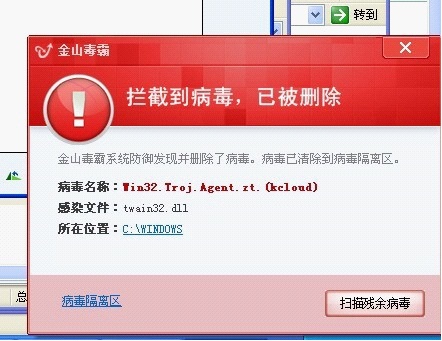 部分殺毒軟件在處理該病毒時(shí),只是刪除了病毒執(zhí)行文件,而未將病毒創(chuàng)建的快捷方式刪除。中毒用戶按空格鍵時(shí),就會立刻報(bào)告“加載twain32.dll時(shí)出錯(cuò)”。由于該病毒的最終目的是遠(yuǎn)程控制用戶電腦,使玩家面臨極大危險(xiǎn)。建議發(fā)現(xiàn)按空格鍵異常的網(wǎng)友立刻使用金山毒霸強(qiáng)力查殺。