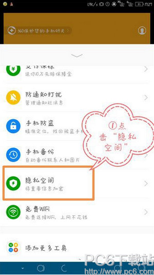 1.進入到360手機衛士之后,可以看到隱私空間,點開它。