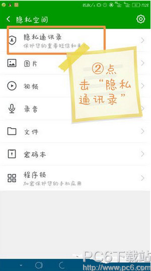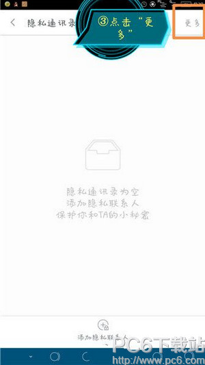 2.進入到隱私空間之后你會看到如圖所示的,隱私通訊錄,點開它。點開之后,在右上角,找到【更多】,點擊更多,如圖。