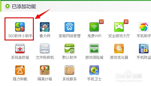3、找到360軟件小助手,如果在已添加功能菜單中沒有找到360軟件小助手的話,可以在未添加功能下的工具中進行添加,然后點擊打開“360軟件小助手”。(如下圖)
