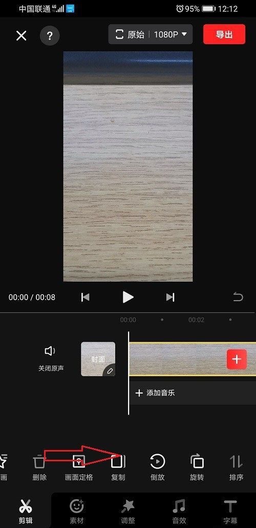 3、進去視頻剪輯界面,向右滑動,找到旋轉,如下圖所示: