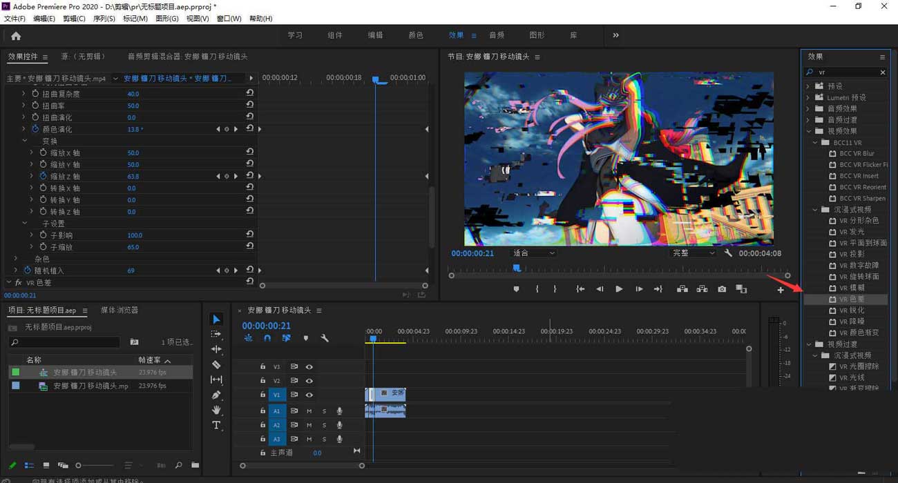 2、效果中搜索vr 數字故障,拖到素材上,勾除自動vr屬性,幀布局改為單向,水平視角60,垂直視角80.