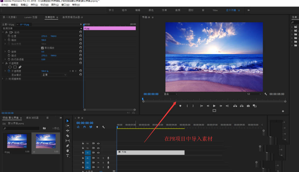 2、新建了項(xiàng)目之后,我們導(dǎo)入素材到PR項(xiàng)目中,創(chuàng)建序列,將素材放到序列時(shí)間軸進(jìn)行一些編輯的操作。