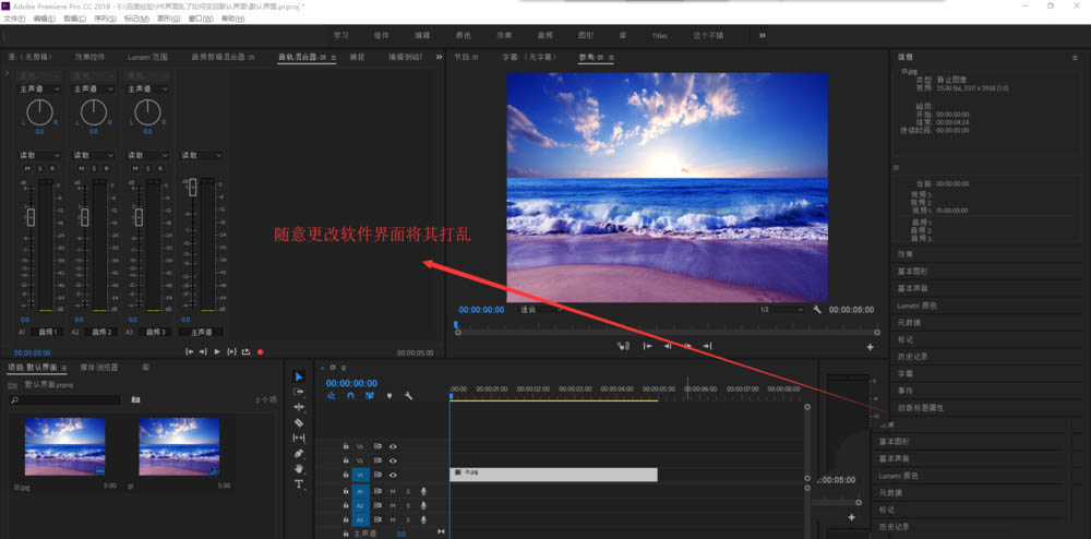 3、我們?cè)诩糨嫷倪^(guò)程中隨便打開(kāi)很多面板出來(lái),還可以隨意的拖動(dòng)這些面板的位置,總之將PR界面徹底打亂。