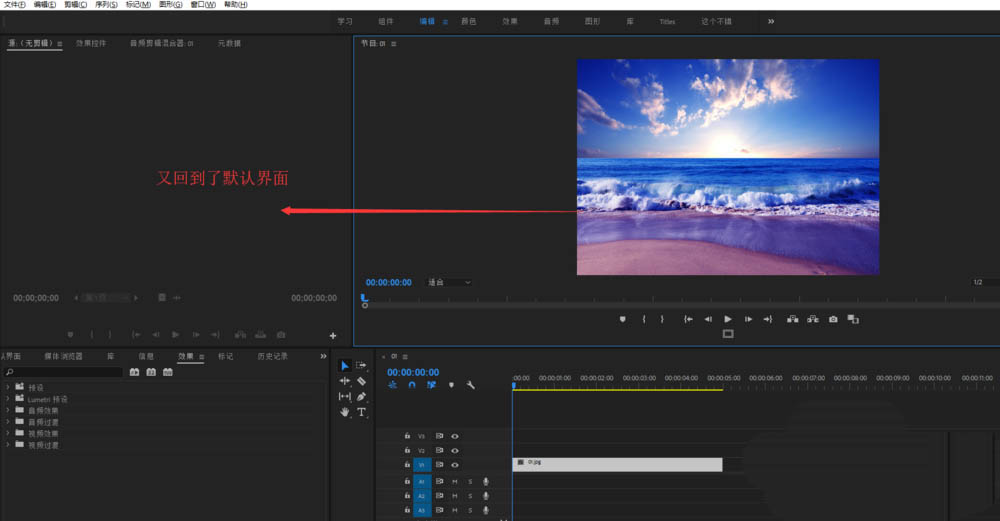 6、選擇了一個(gè)默認(rèn)界面之后,等待PR界面面板重新排列,就可以看到一開(kāi)始我們打開(kāi)PR出現(xiàn)的默認(rèn)界面了。