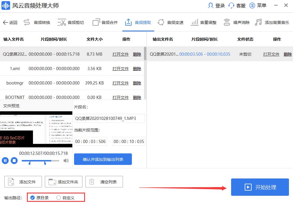 5、修改輸出目錄,設(shè)置剪切的視頻是原目錄輸出還是自定義。修改完輸出目錄后,點(diǎn)擊開始處理