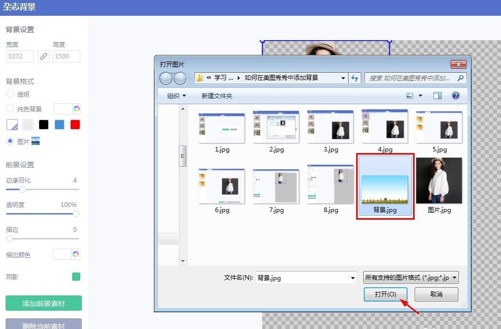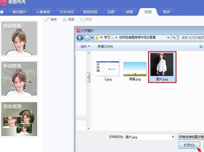 第二步:選中需要添加背景的圖片,單擊“打開”按鈕。