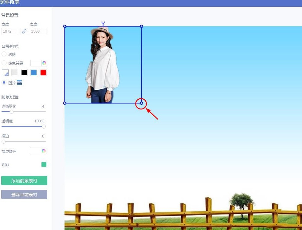 第七步:拖動人物圖片四周藍色小圓圈,將圖調整到合適的大小,并放到合適的位置,單擊“完成”按鈕。