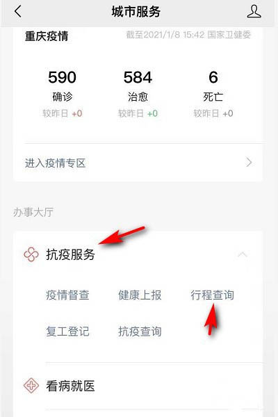 2、接著點(diǎn)擊城市服務(wù)中的行程查詢。