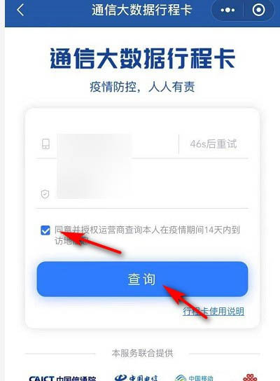 5、最后通信大數(shù)據(jù)行程卡頁面輸入電話和驗(yàn)證碼并同意授權(quán),點(diǎn)擊查詢即可。
