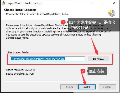 3.點擊“browse”選擇更換軟件安裝目錄,最后點擊install開始安裝軟件,默認目錄:c:\program files\rapidminer\rapidminer studio 。如圖