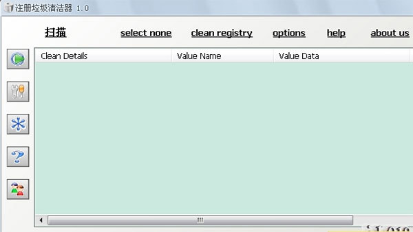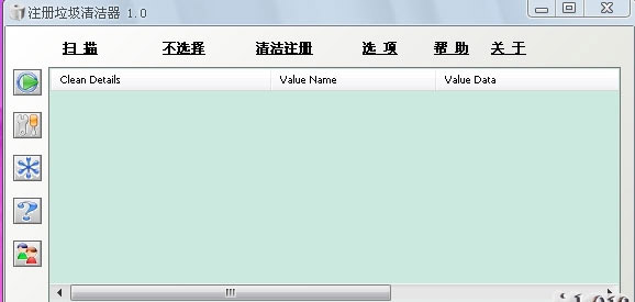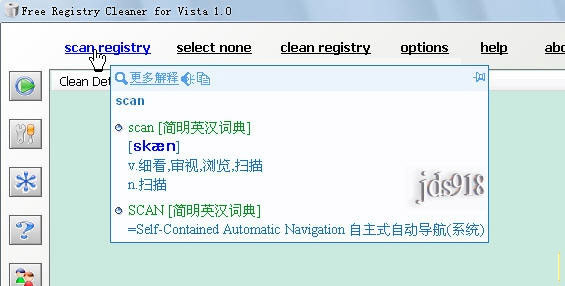 打開regcleanerforvista英文版,瀏覽一下界面,初級最好做個截圖,這樣直觀一點,隨時查看界面英文,好了看到
